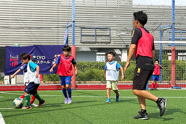 FC東京サッカースクール日曜日のコーチが担当します。コーチの指導の下、楽しみながら試合をメインに練習を行います。