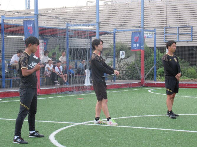 塁コーチを始め、普及部のフットサルスクールコーチが見守る中でまずは挨拶!
