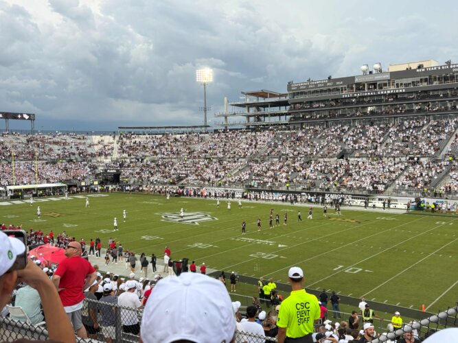 大学のアメリカンフットボールの試合も観戦しました!ホーム開幕戦だったこともあり、多くの学生がスタジアムに来場し盛り上がっていました!雷雨の影響で20分程しか観戦できず、とても残念でしたが初めてのアメリカンフットボール観戦ができて良かったです!