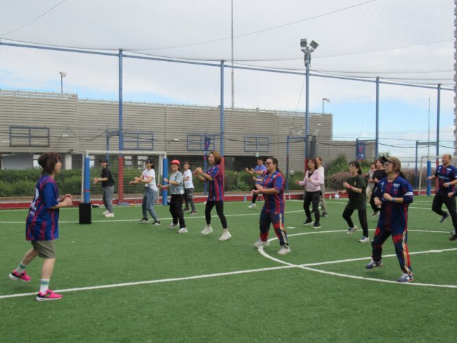 講師としてお招きしています倉谷理恵子先生です。FC東京の応援ソングにあわせてウォーミングアップをアレンジしてくれました。